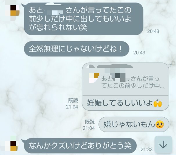 そして前回14週の時に、騎乗位でにな君が私の中で暴発してしまったアクシデントがあり、私は「妊娠してるから少しだけ中に出してもいいよ」と話していました。にな君とLINEでやりとりしているときにこんな話題が… 以下実際のLINEです。