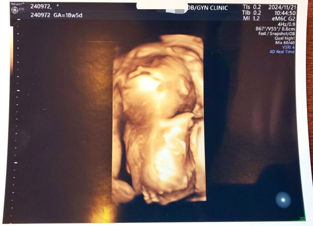 4Dのエコーでは真後ろを向いていて顔を見ることはできませんでした笑 耳や背骨も見えています。2Dエコーの時は腕を動かしたり脚をジタバタさせていました。18週に入ってからなんとなく胎動がわかるようになってきて、特に私が喋るとお腹の中がニョロニョロ動くようになりました。コールセンター勤務なので部下に指導したり、私が上席対応でお客様と直接お話することが多いのですが、その間お腹がもぞもぞ動いています笑 仰向けで寝てる時は特に胎動がわかりやすいです。
