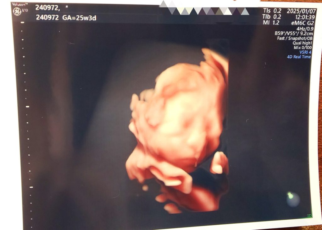 2Dエコーではしっかり横顔が見れましたが、先生が映してくれたモニターを見てびっくり!お人形さんのような我が子が口元の前で両手をグーにして寝ている姿でした!