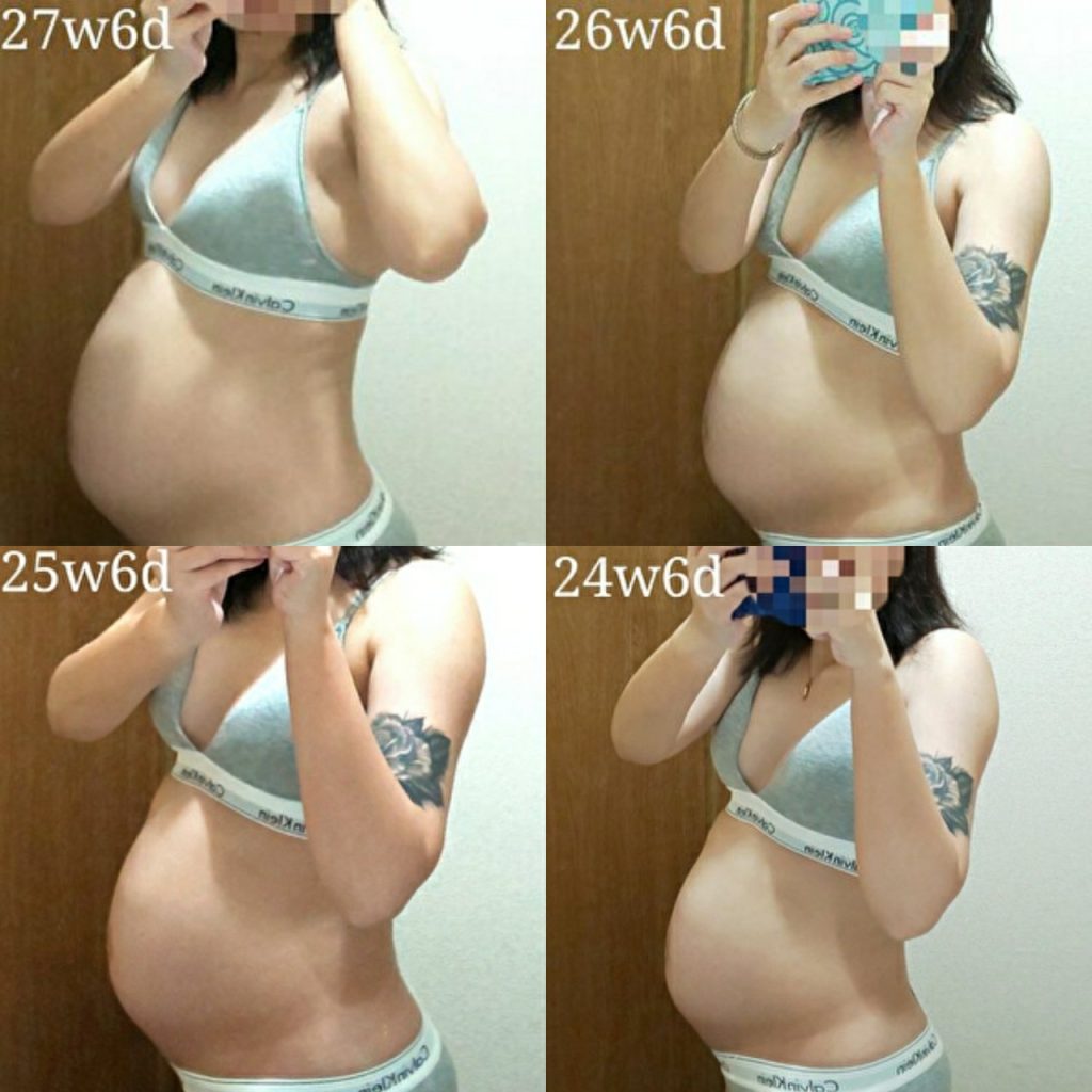 そしてこちらが妊娠7ヶ月の経過をまとめた画像です。26w6dと27w6dのお腹の大きさが断然違うのがわかるかと思います…。過去最高体重を更新し続けているので、体が重くて仕方ありません。そしてこのカルバンクラインの下着ですが、ブラとショーツどちらもパッツパツになってきて、このお腹の写真を撮ってる間にいつかはち切れるんじゃないかとヒヤヒヤしてます笑 画像だとわかりにくいですが胸もだいぶ大きくなって実は既に母乳が出ています。