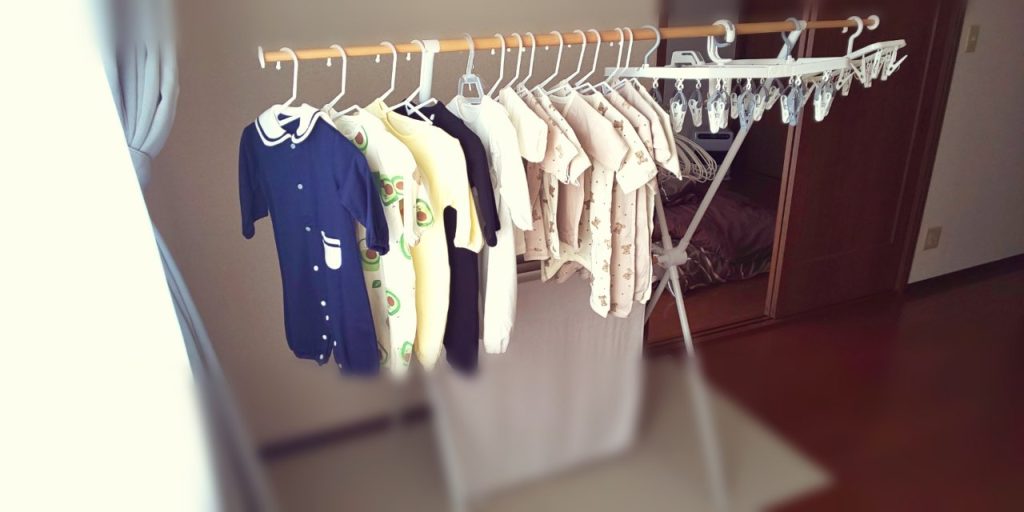 布団のシーツなどの大物や、糸物などのおしゃれ着も寝袋君がいない間に洗濯しちゃいます。もちろん自分の分だけです。寝袋君の分は知らん。この日は天気が良かったのでベビー服の水通しをしました。……このサイズの服並んでるのかわいすぎません????? あとアボカド柄の服とか意味わからなくて逆に可愛いですよね?????
