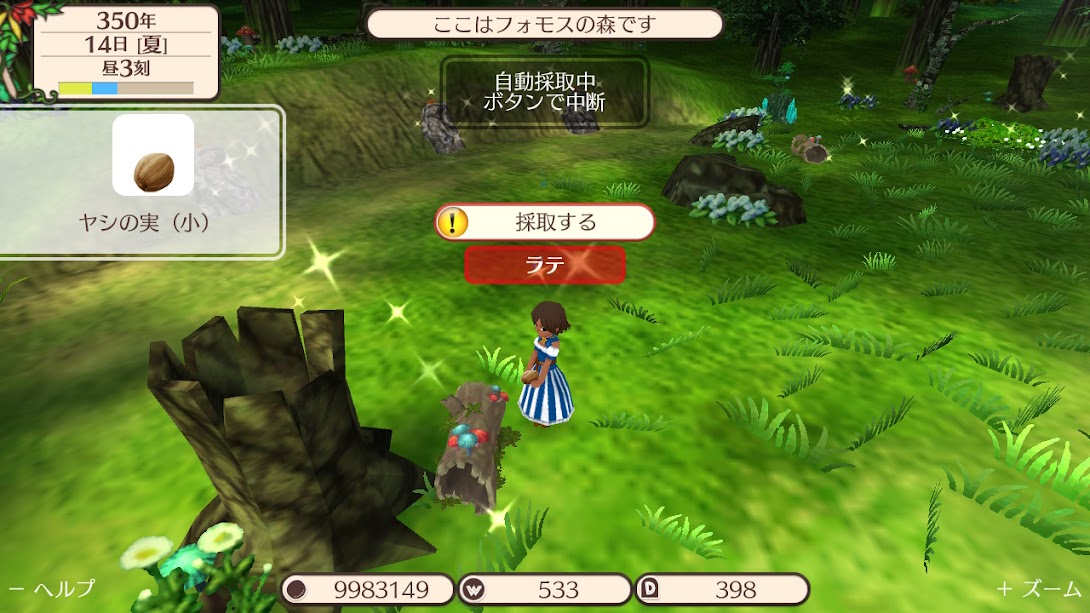14代目ビオラでやり残していた、まだ作っていない料理をクリアするために、ゲーム内時間の数年ぶりにフォモスの森(特別なアイテムを使って入れる、いろんなレアアイテムが手に入る場所)に行きました。ここも燃え尽き症候群で離れている間にアプデで採取できるアイテムが追加されたり、釣れる魚が増えたりしているそうです。