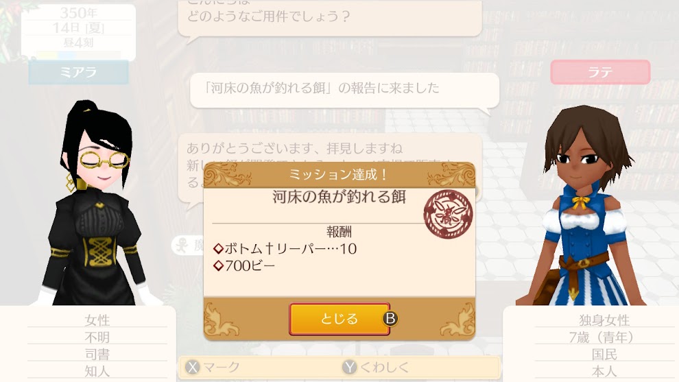 このゲーム、レアアイテムのドロップ率がとんでもなく低いんです。アプリ版だともっと低いとかなんとか。とある魚(というかカエル?)を釣るミッションでは、夏限定で釣れる確率がめちゃくちゃ低いのに加えて、PCの能力が高くないと釣れないので、ミッションクリアにゲーム内時間3年ぐらいかかりました。見た目カエルなので釣れたとき悲鳴が出そうになりましたけど…