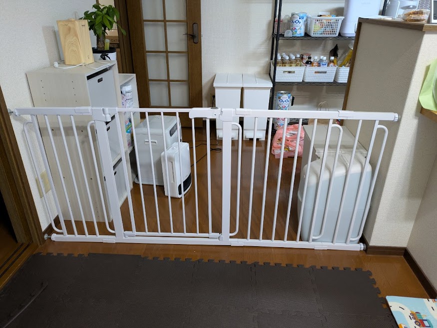 長さを測ってワイドサイズにして正解だったー!賃貸アパートなので突っ張り式、壁傷つけてません。拡張パーツを3つ使ってるので多少はぐらつきますが、クソゲートに比べたらかなり頑丈で許容範囲です。拡張パーツを使わずに狭い場所で使ったら全然ぐらつかないと思う。設置後に後追いららまるの猛攻撃を受けていましたが今のところ問題ないです。片手で扉は空くし、勝手に締まるし、これが1万で買えたのはかなりお得なのでは!?