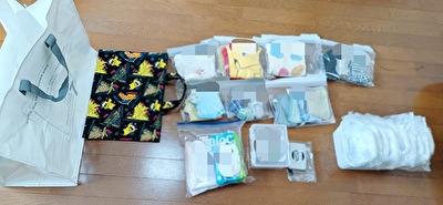 これ+お昼寝用のお布団セットですよ…。画像小さいから量少なく見えるかもしれませんが、小分けした袋の中は3~5着ずつ肌着だの半袖だの長袖だのズボンだのスタイだのエプロンだの色々入ってます。紙オムツなんて10枚です。多いな!!